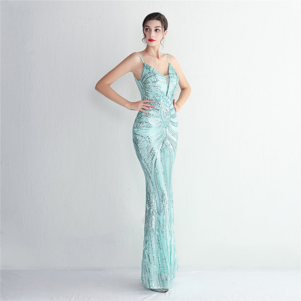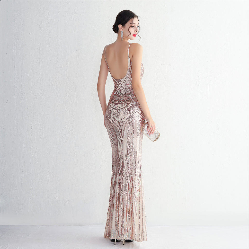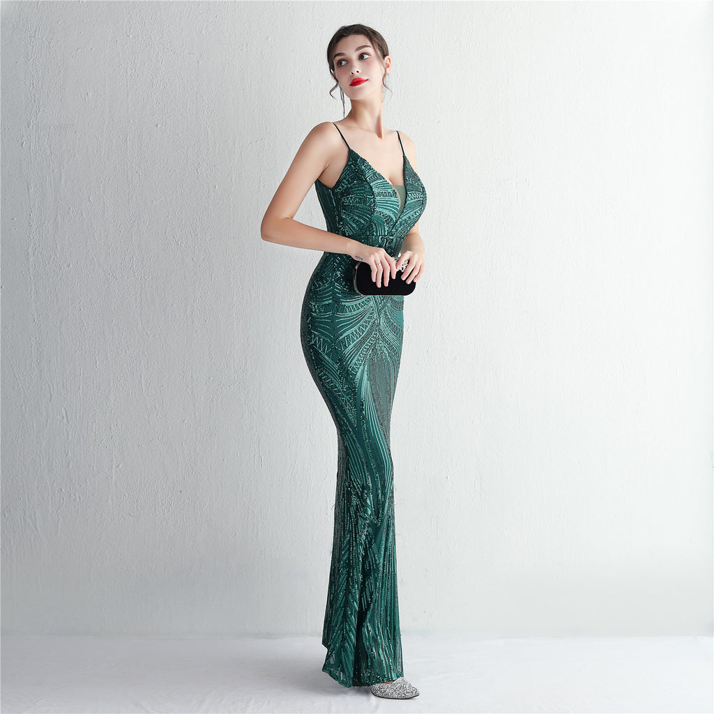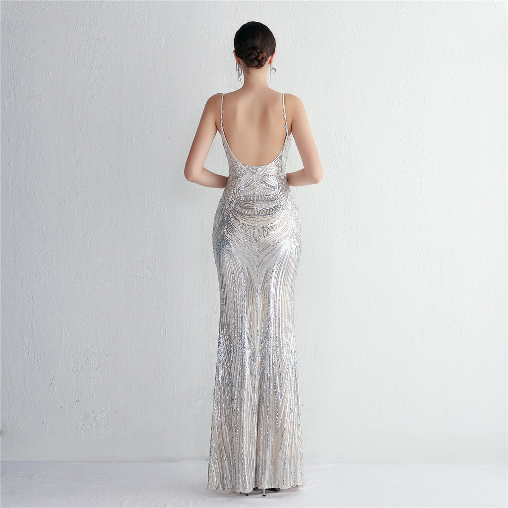 Slim-Fit Sequin Evening Gown with Floral Straps