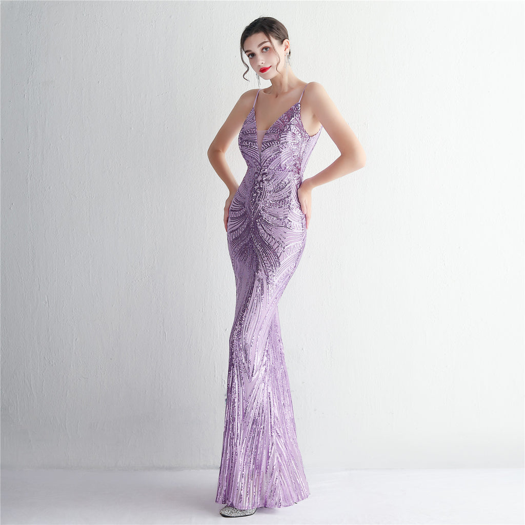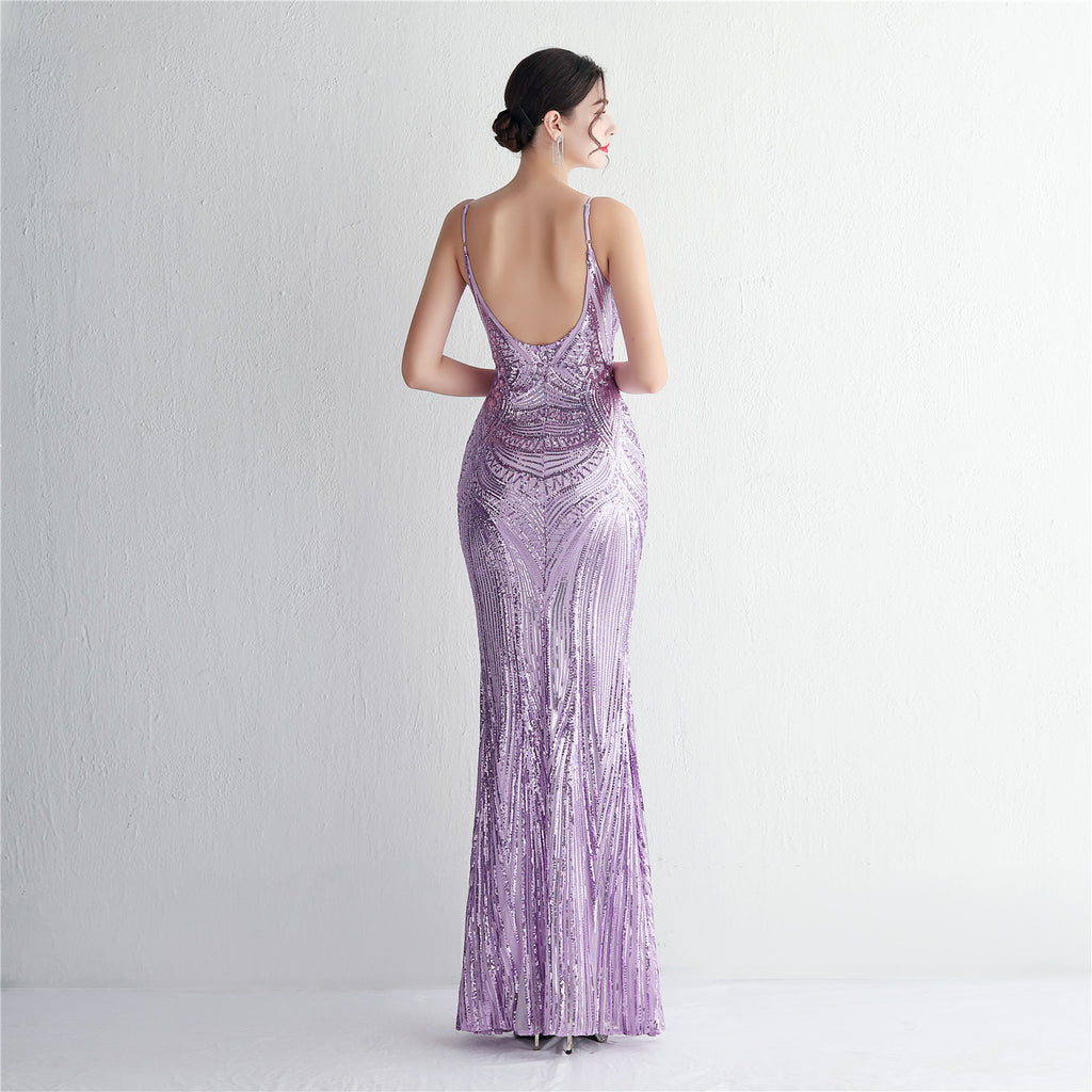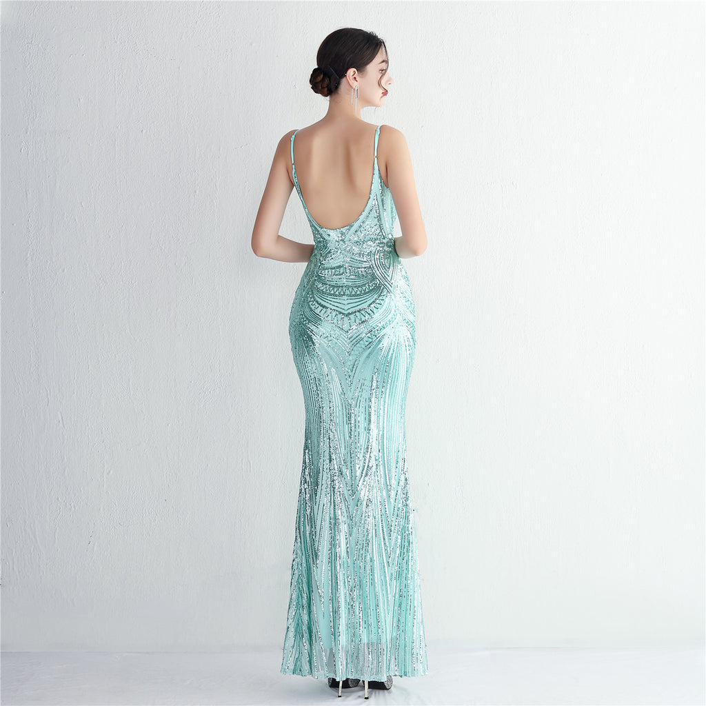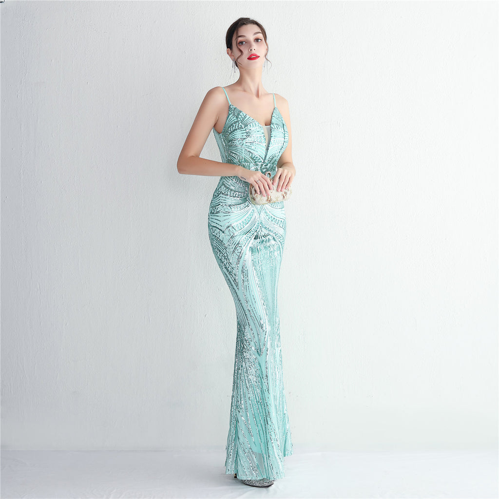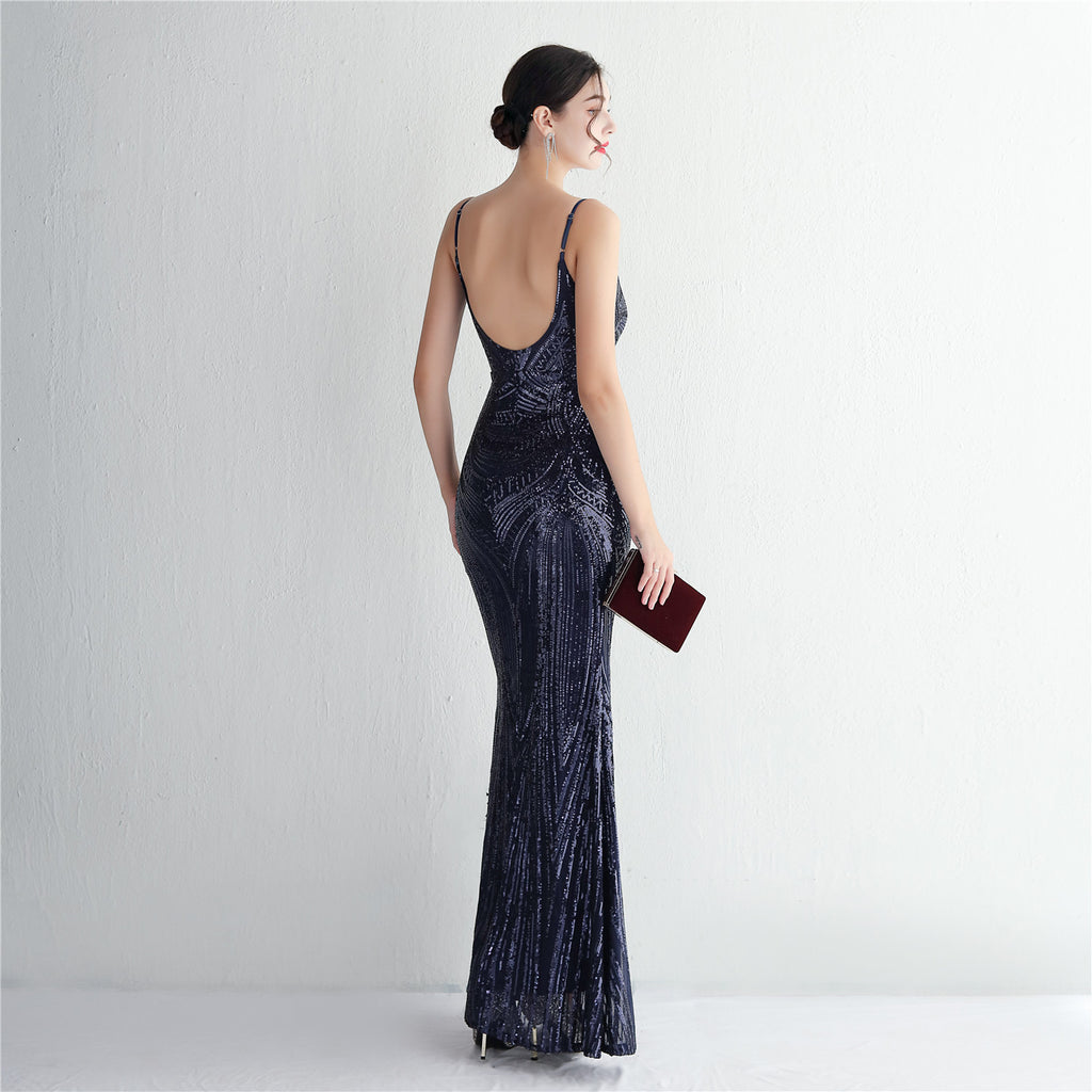 Slim-Fit Sequin Evening Gown with Floral Straps