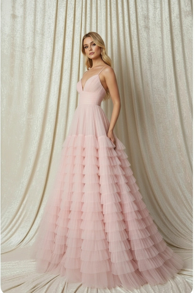 Spaghetti Straps V-neck Pleated Bodice A-line Tiered Tulle Skirt Prom Dress