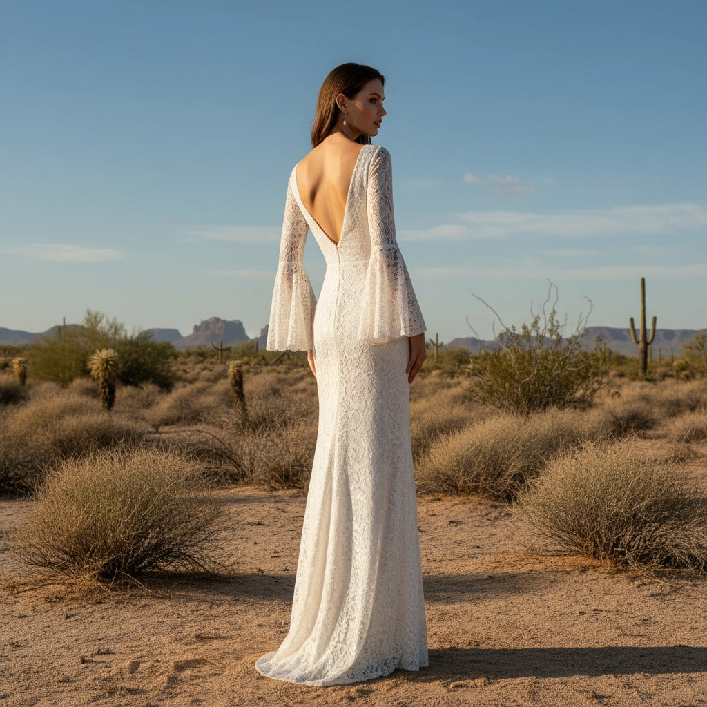 Scoop Neck V-Back Long Bell Sleeves Sheath Lace Wedding Dress with Brush Train