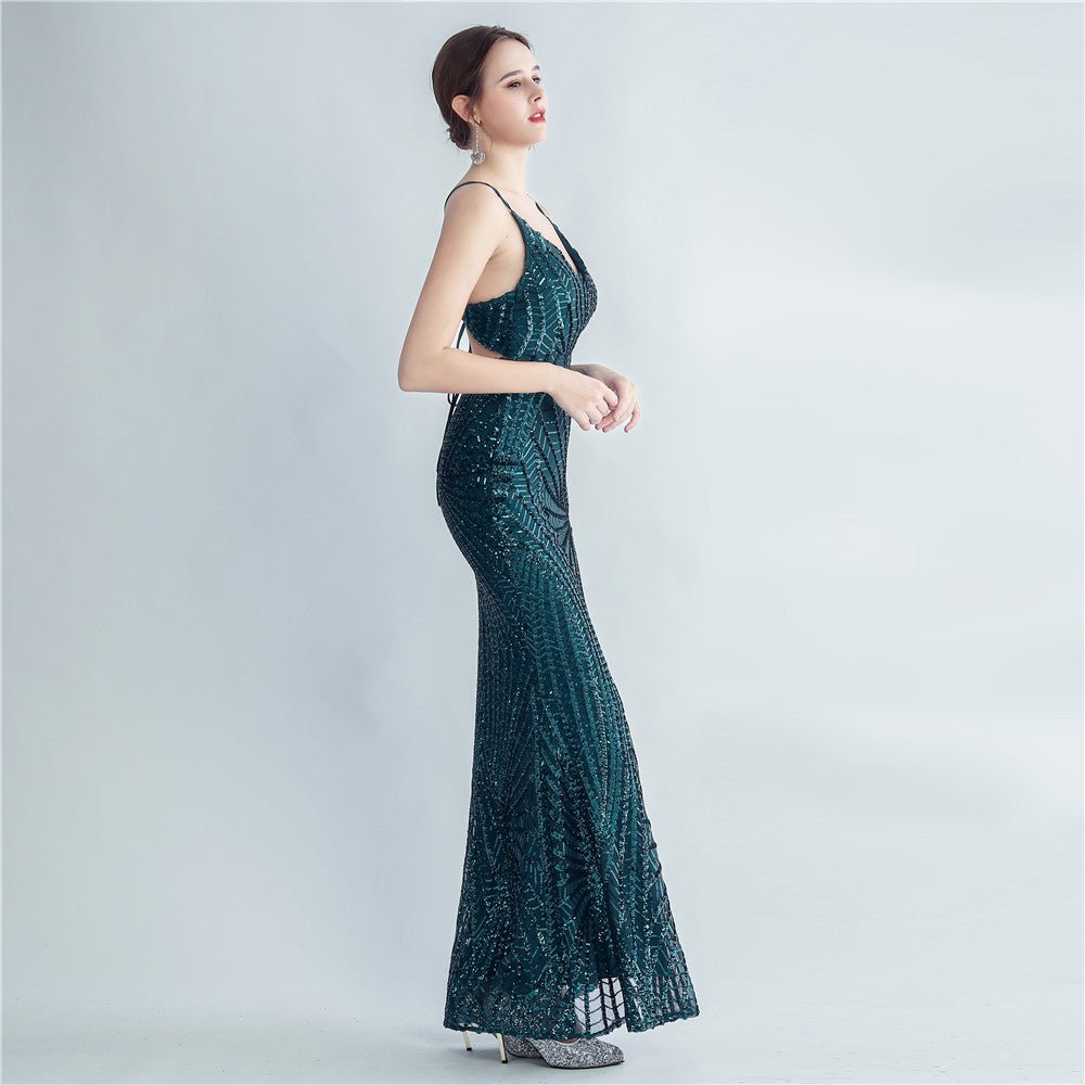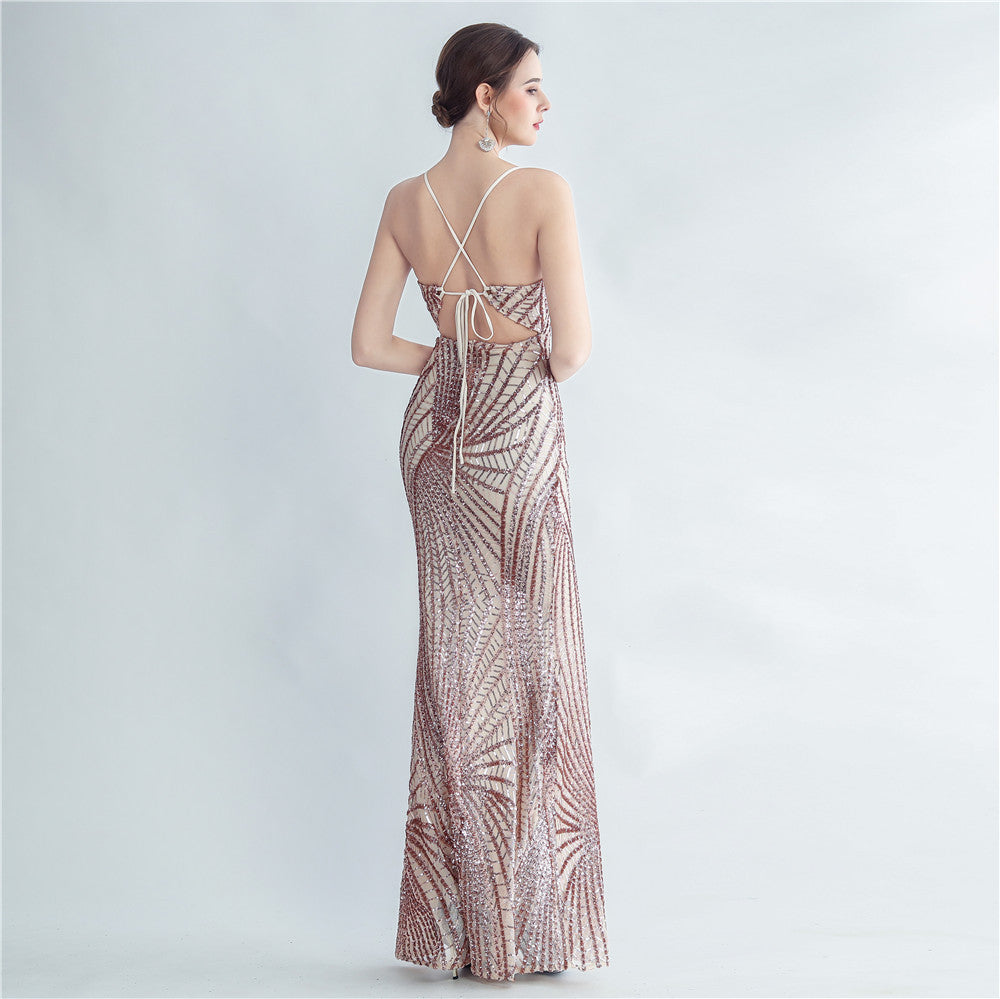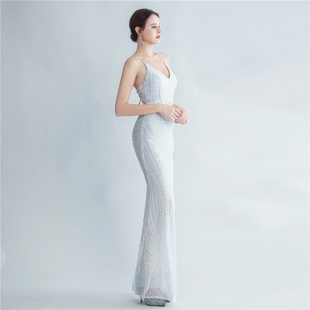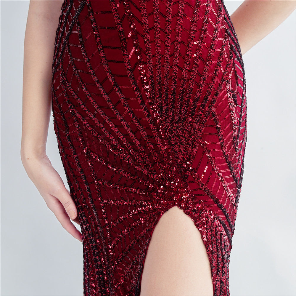 High-Neck Gown with Dense Sequins, Side Slit & Corset Lacing