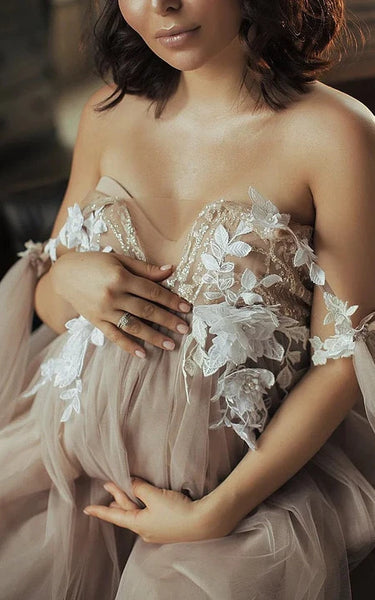 Maternity Casual Strapless Tulle Empire Lace Applique Wedding Dress with Beadings