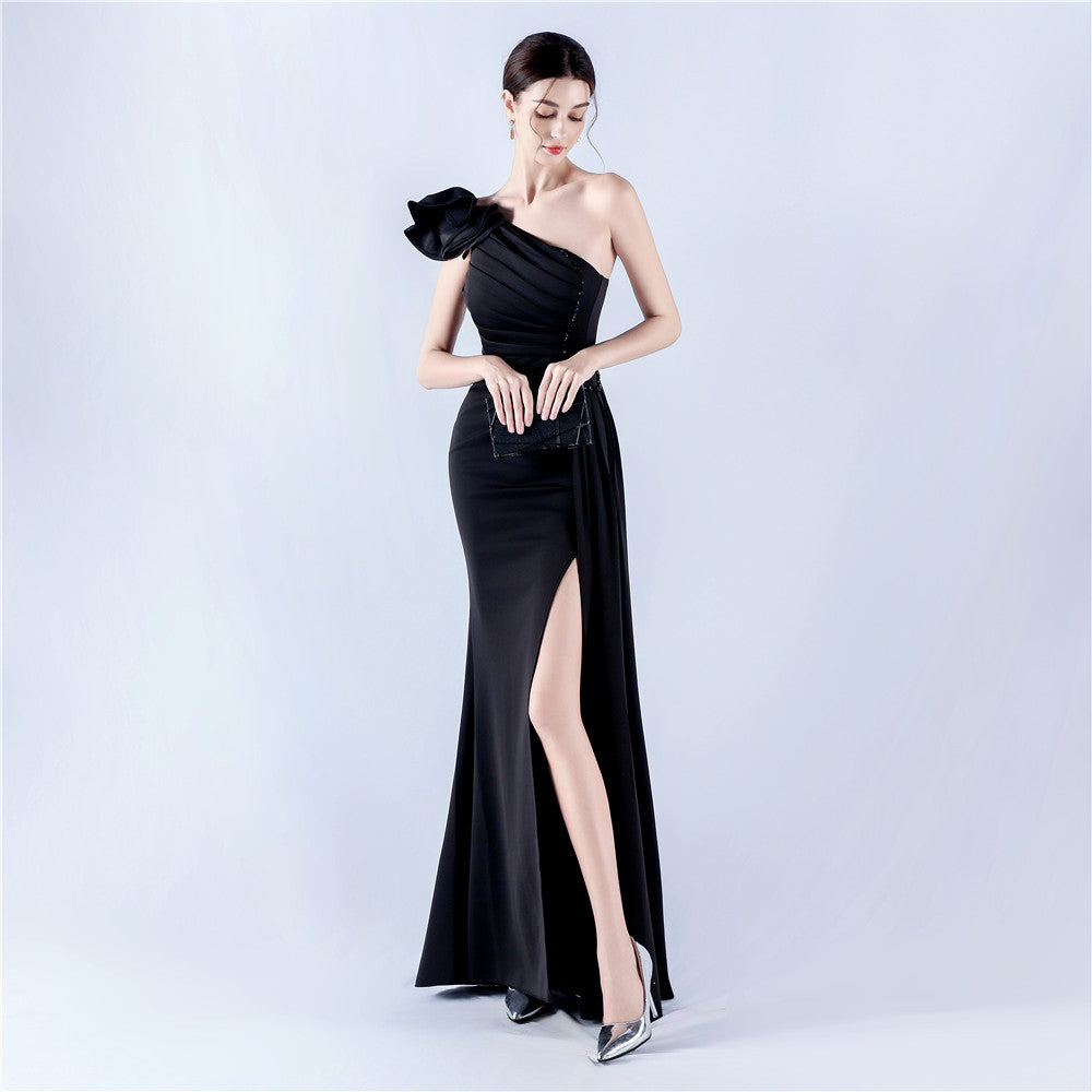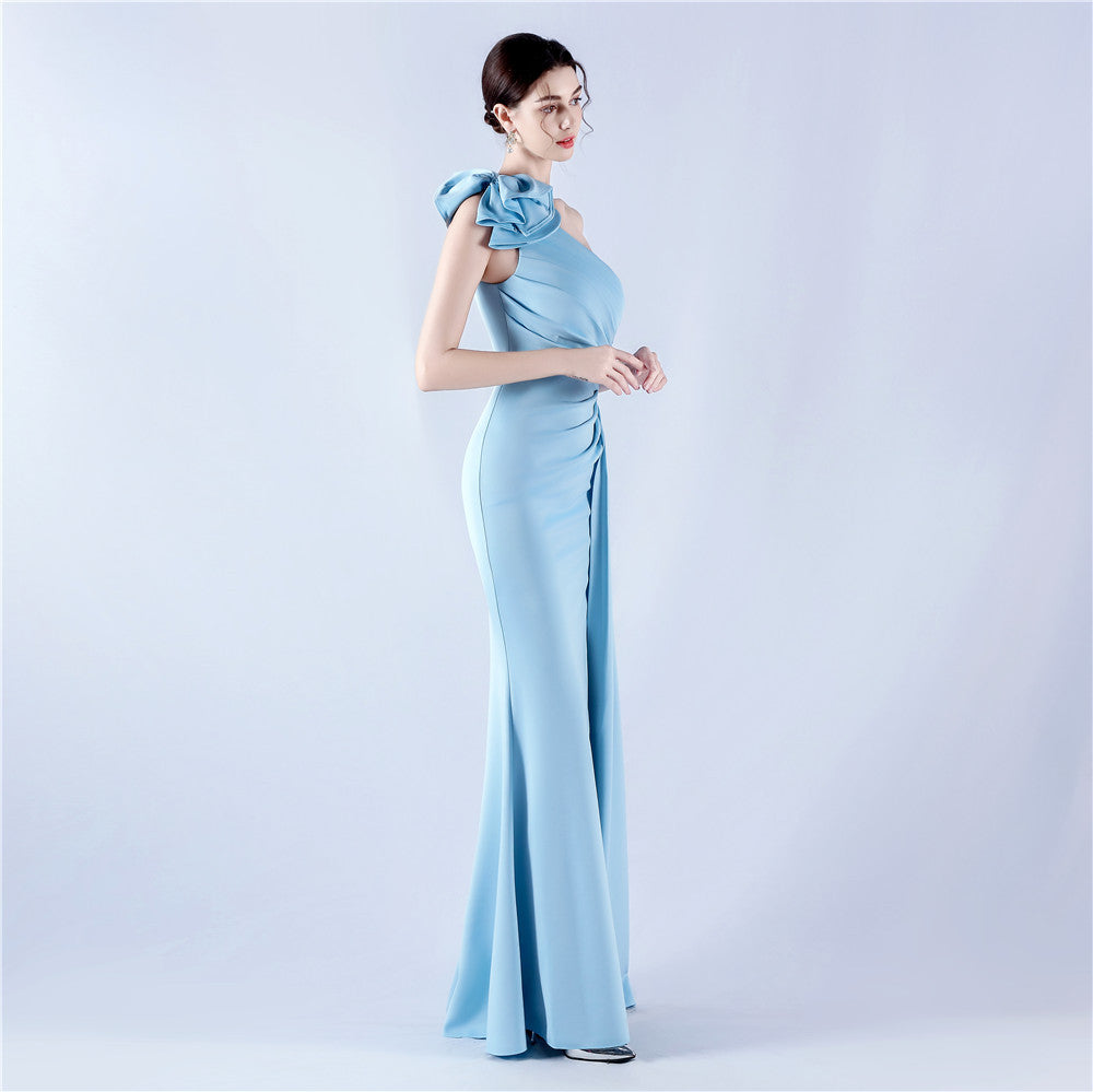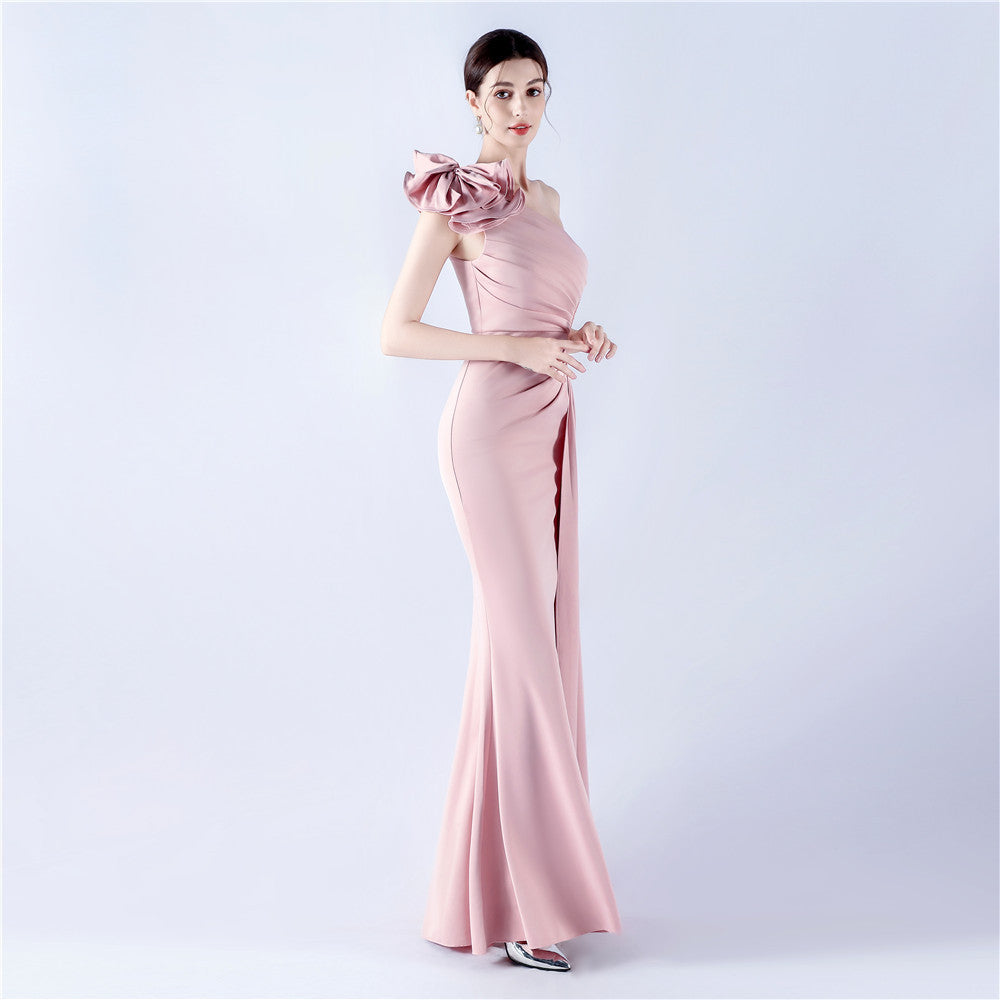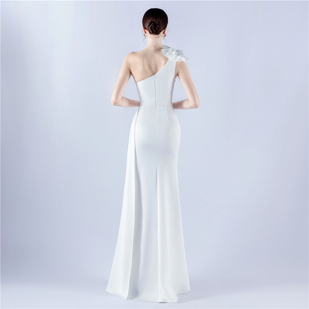 Asymmetric Neckline Gown with Ruffled Shoulder & Rhinestones