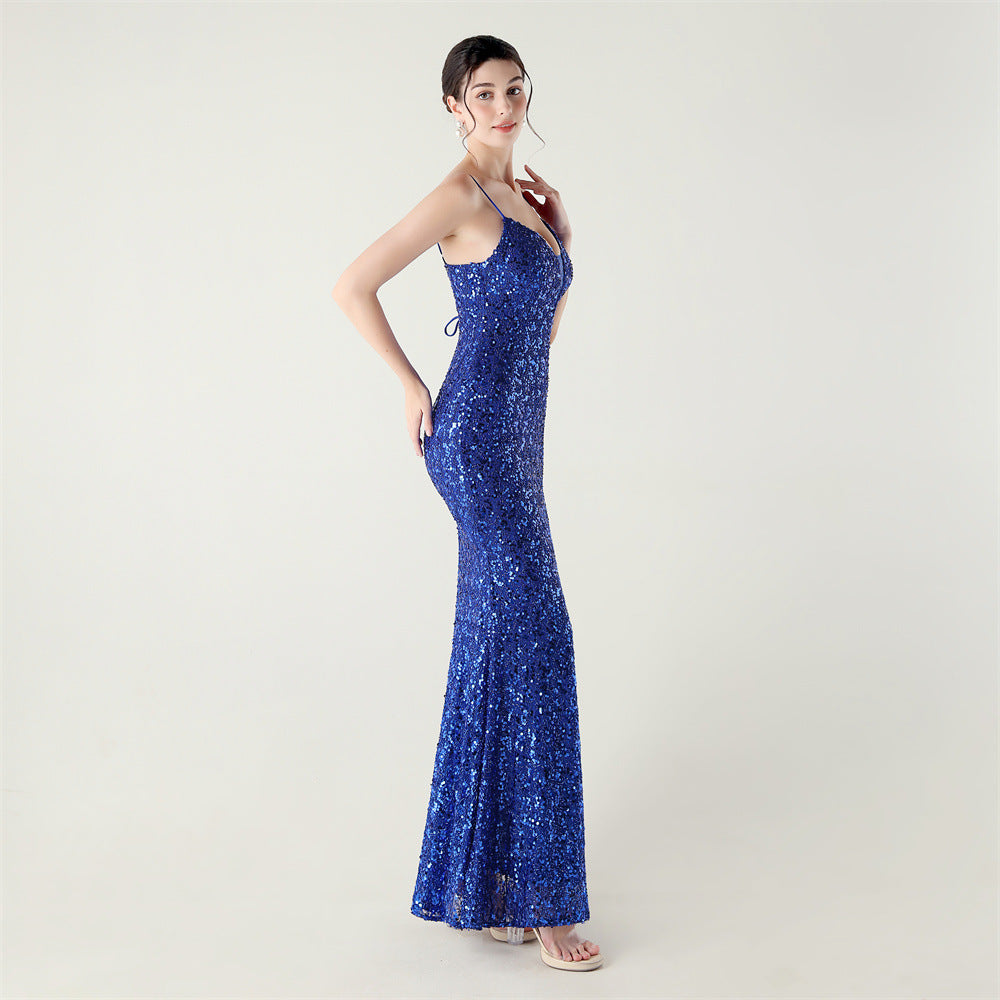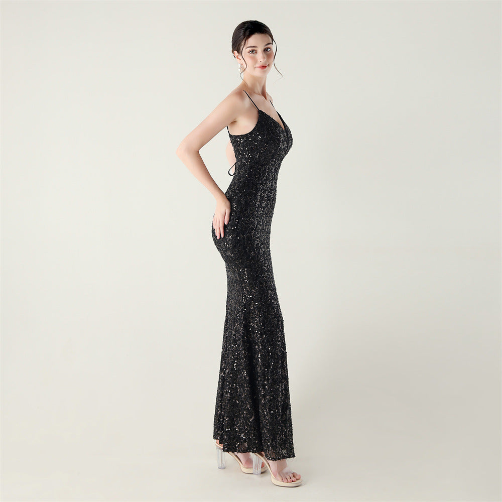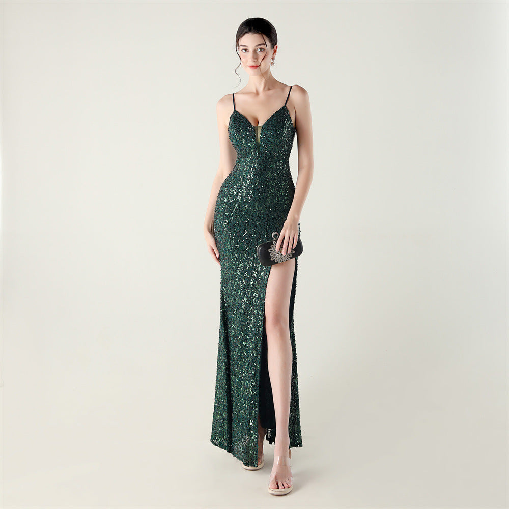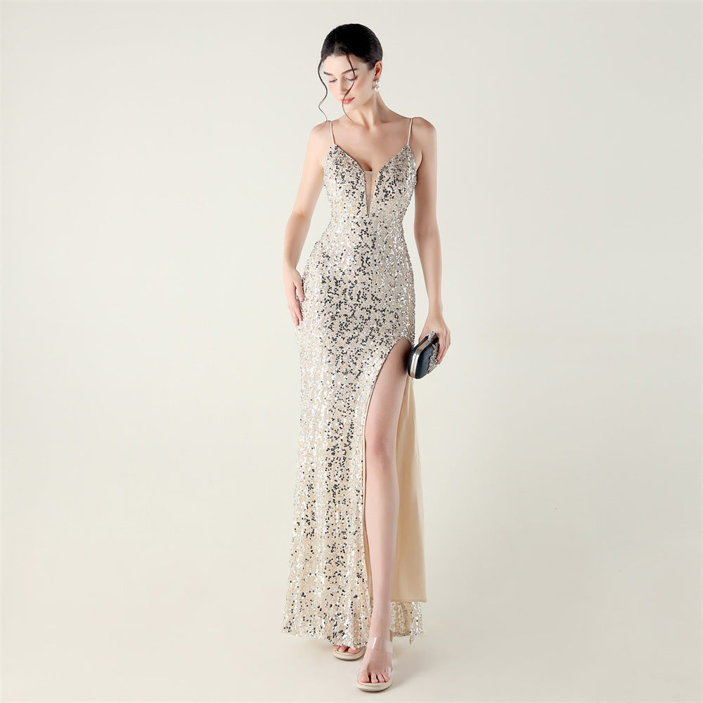 High-Slit Slip Dress with Spaghetti Straps, Beaded Piping & Lacing