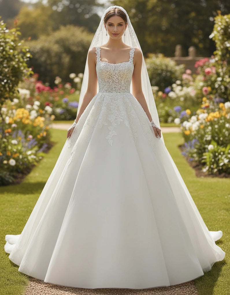 Square Neck Sleeveless Ball Gown Lace and Tulle Wedding Dress