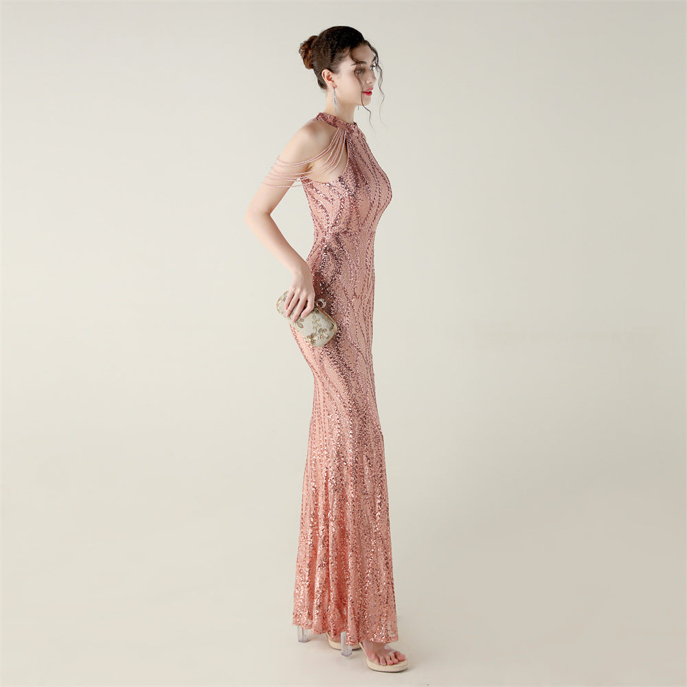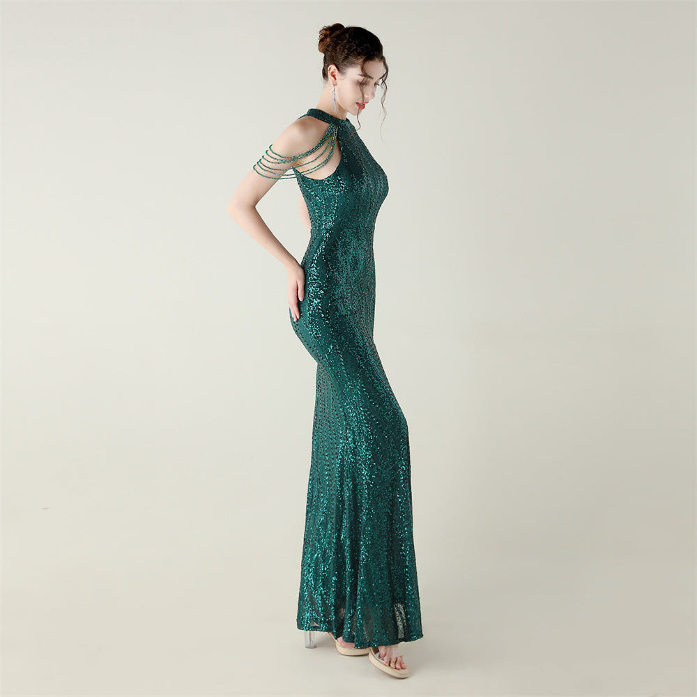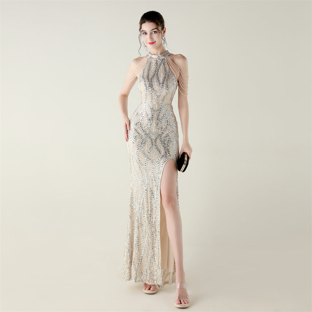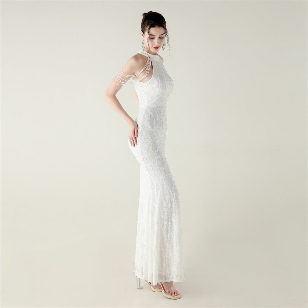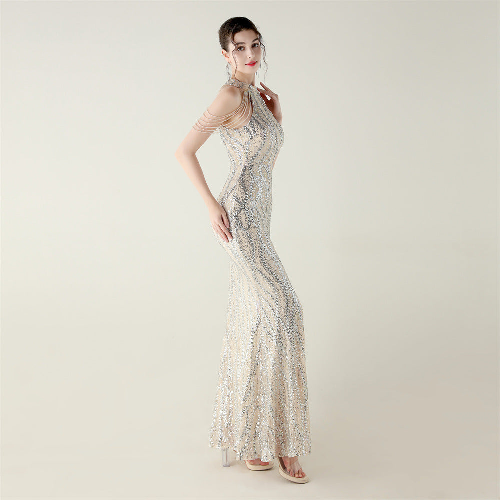 Off-the-Shoulder Halter Gown with All-Over Sequin & Beadwork