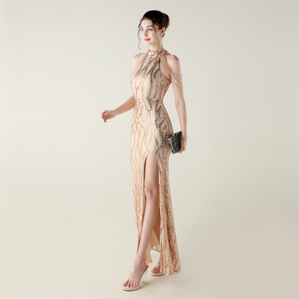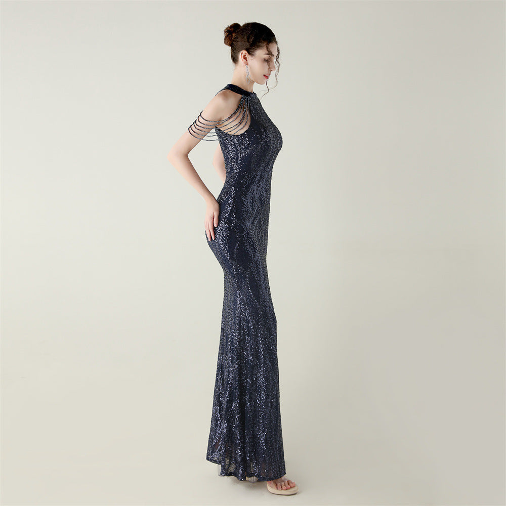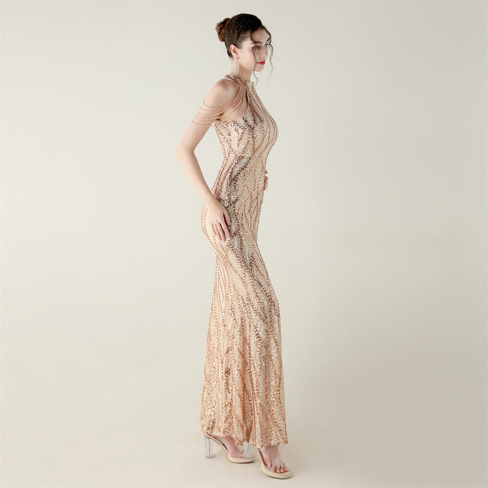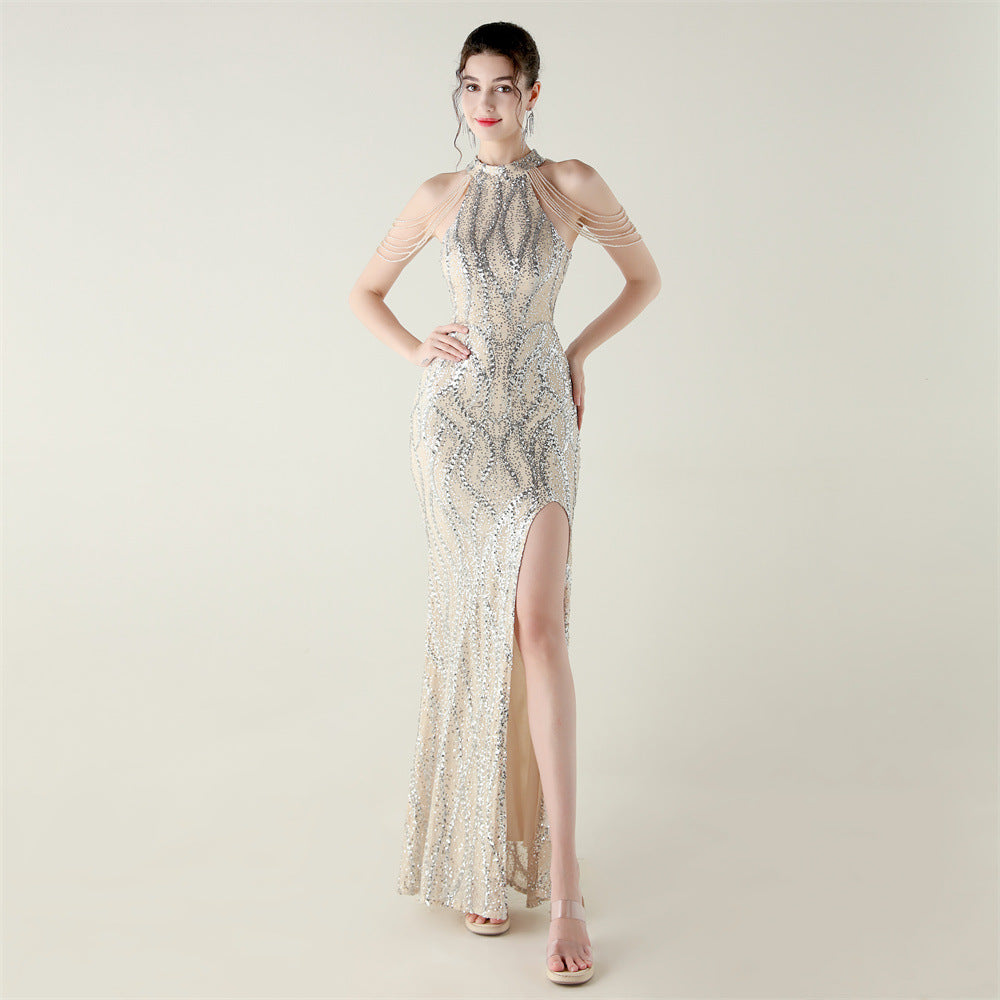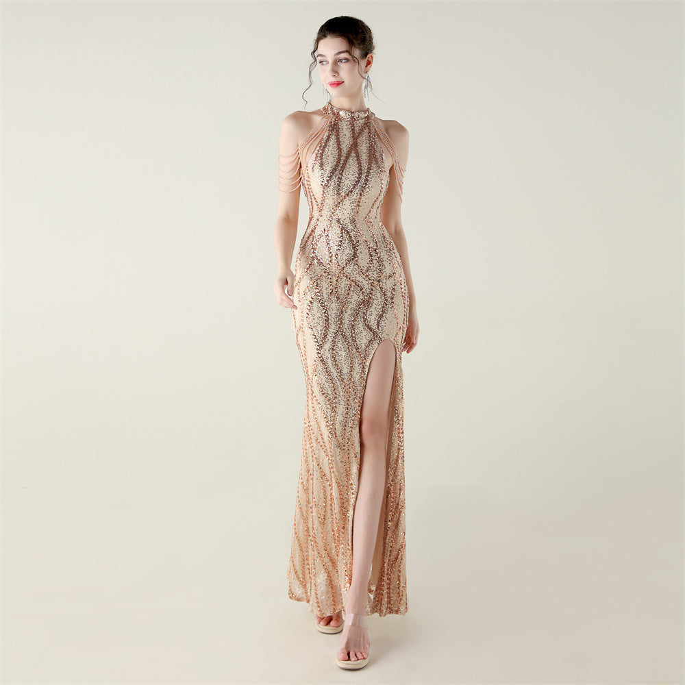 Off-the-Shoulder Halter Gown with All-Over Sequin & Beadwork