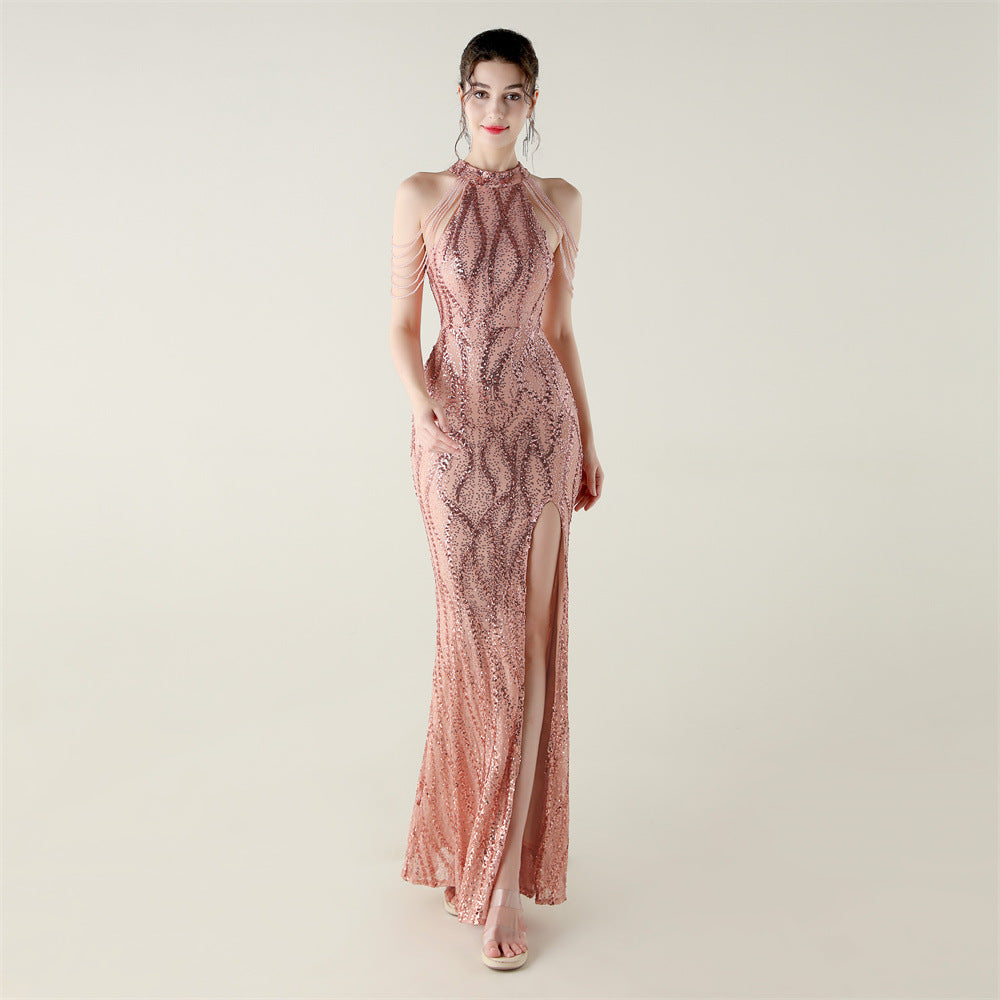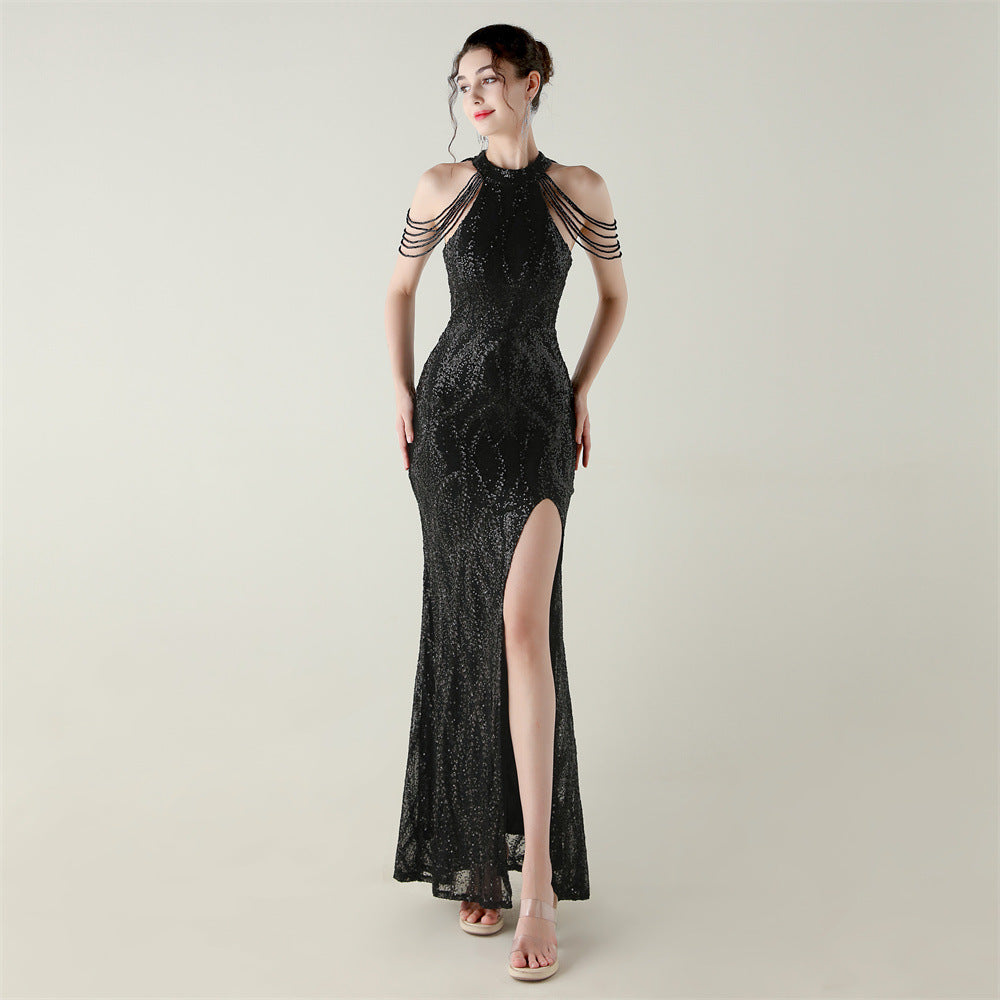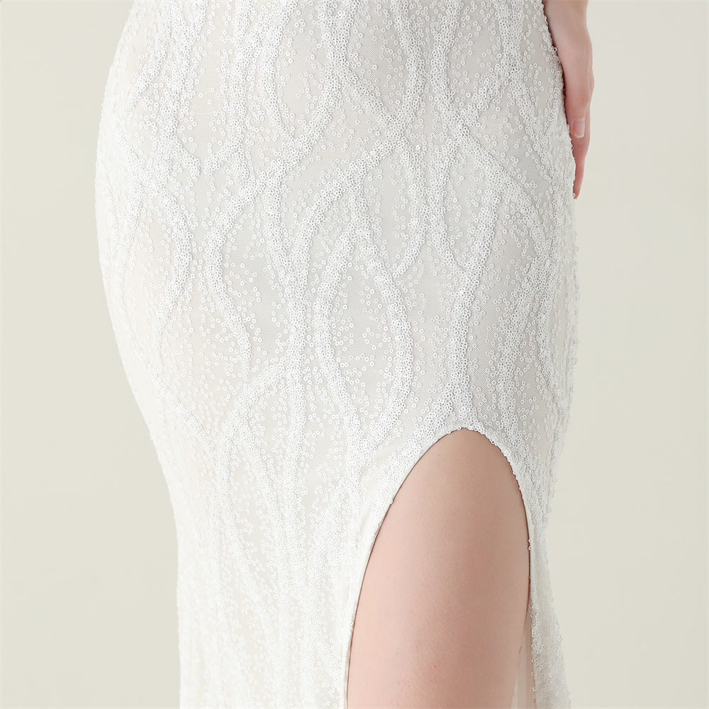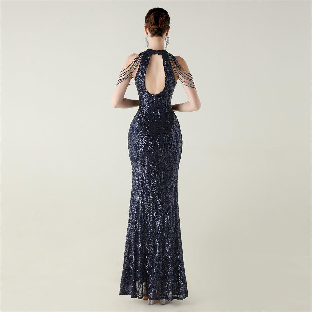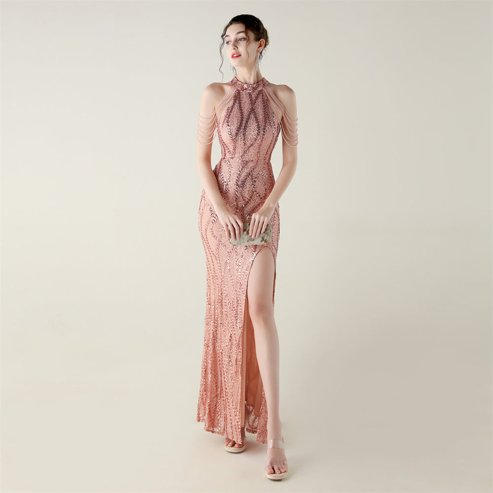 Off-the-Shoulder Halter Gown with All-Over Sequin & Beadwork