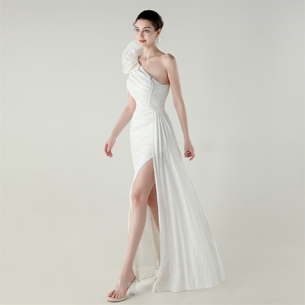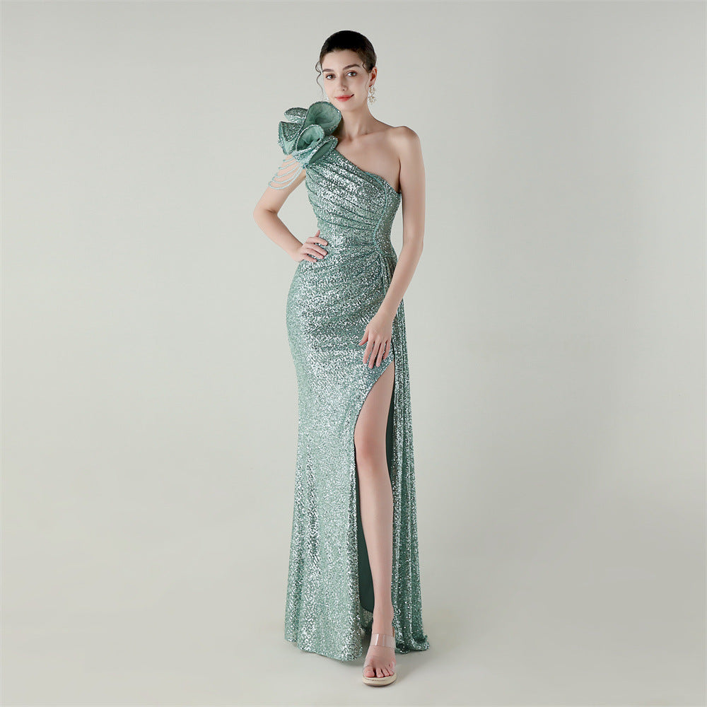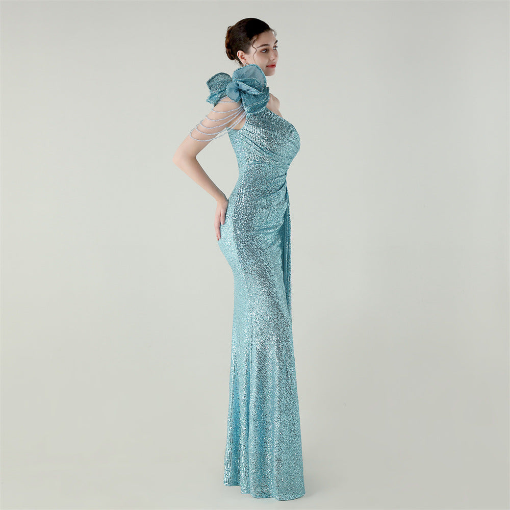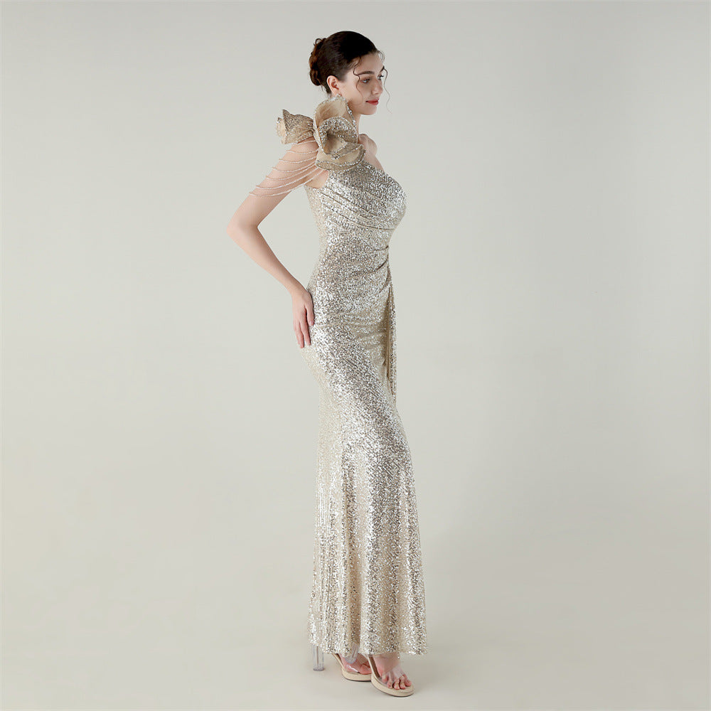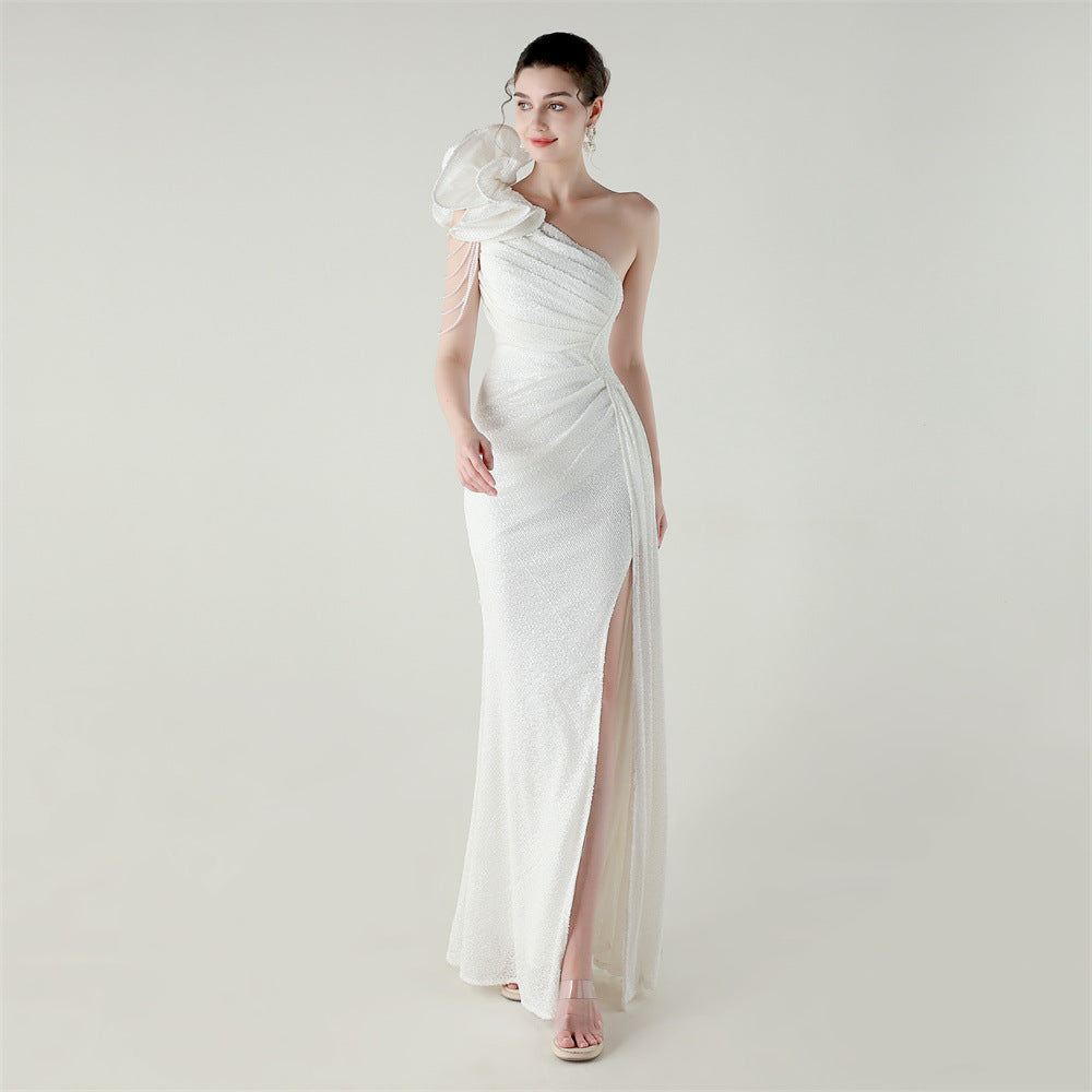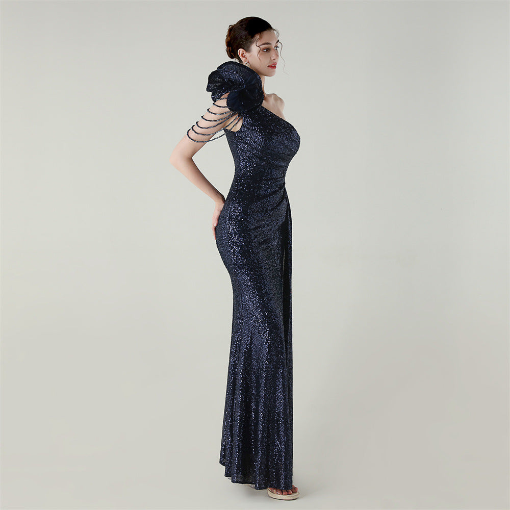 One-Shoulder Asymmetric Mermaid Gown with Floral Beadwork