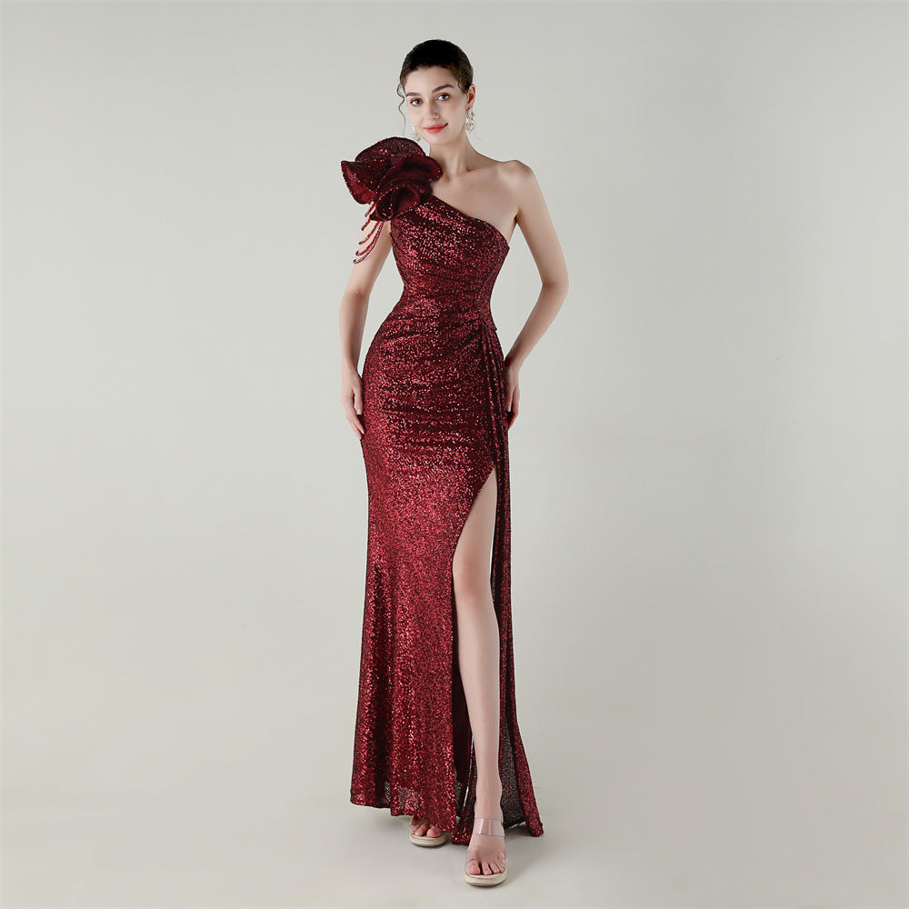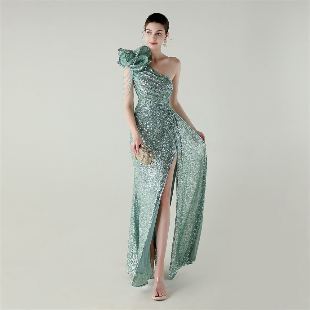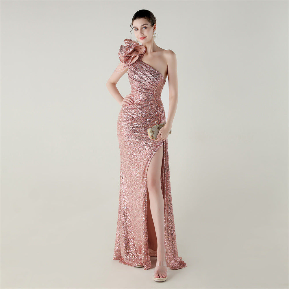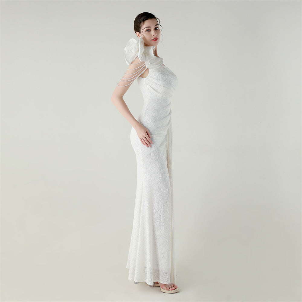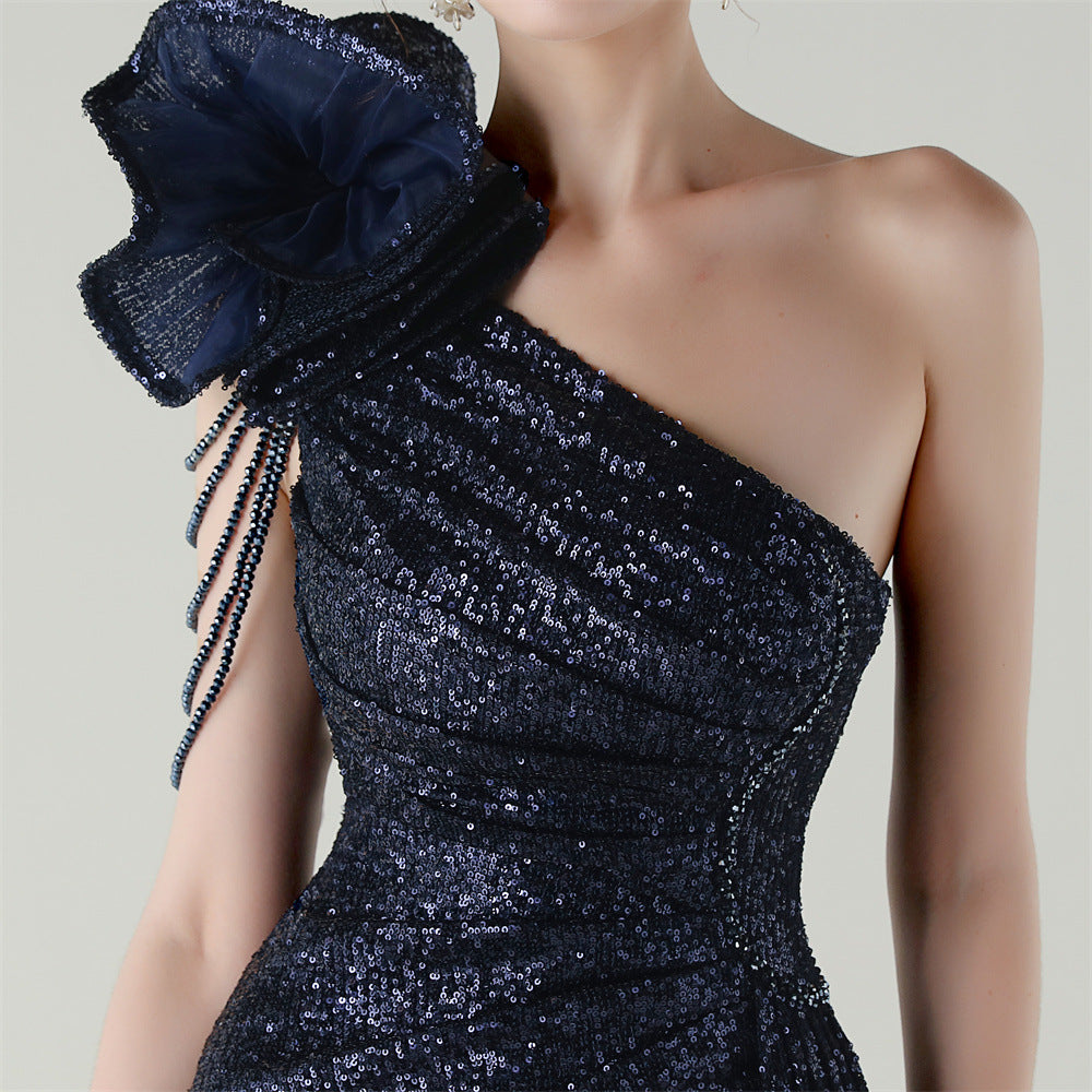 One-Shoulder Asymmetric Mermaid Gown with Floral Beadwork