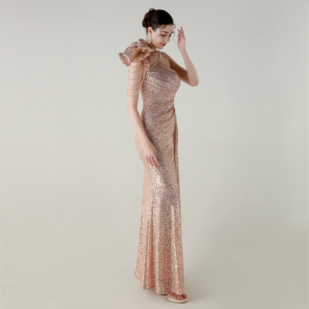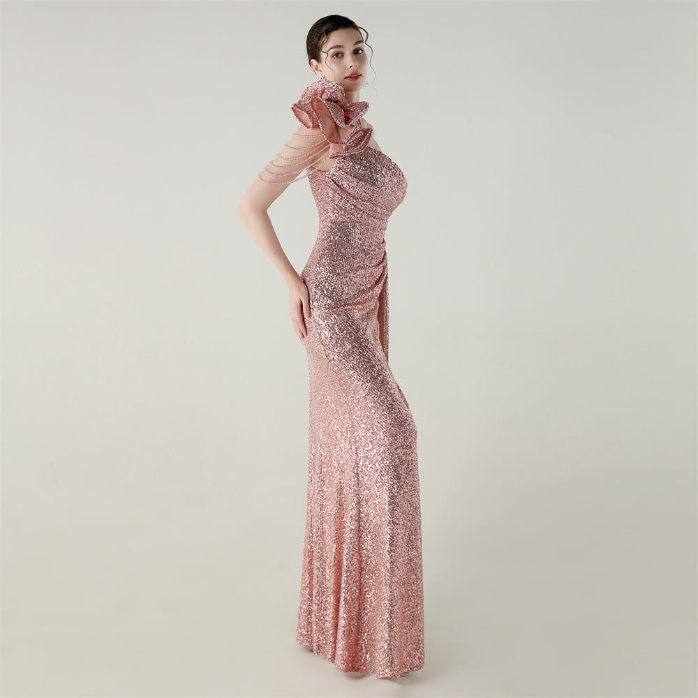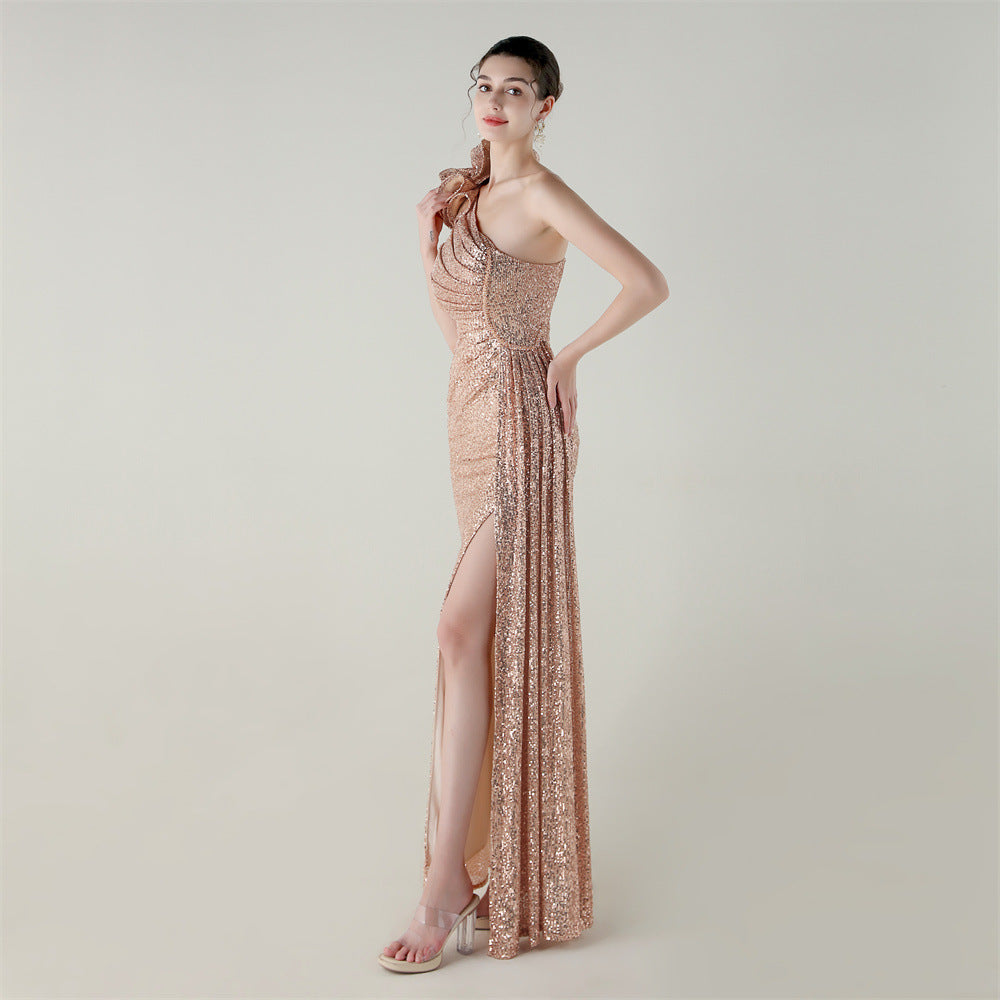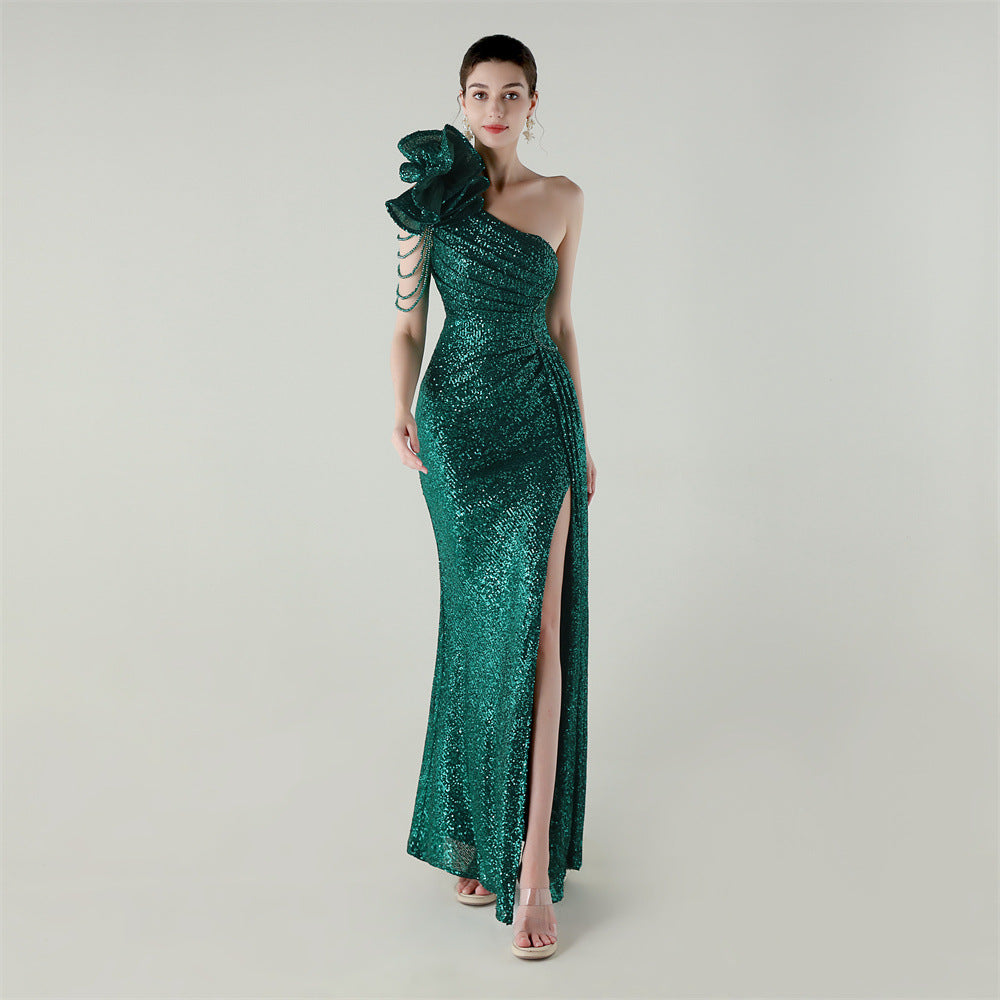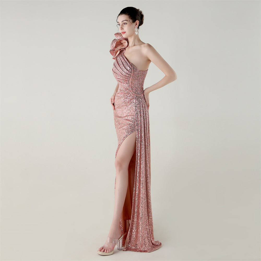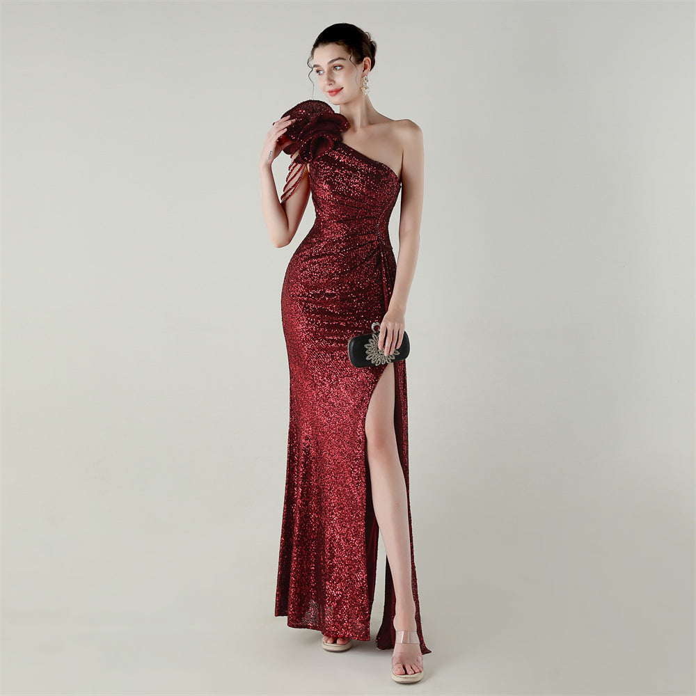 One-Shoulder Asymmetric Mermaid Gown with Floral Beadwork