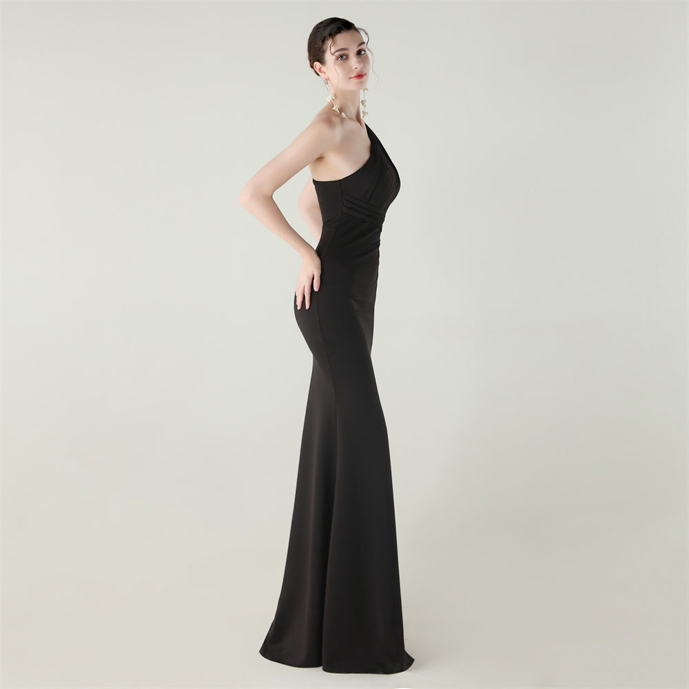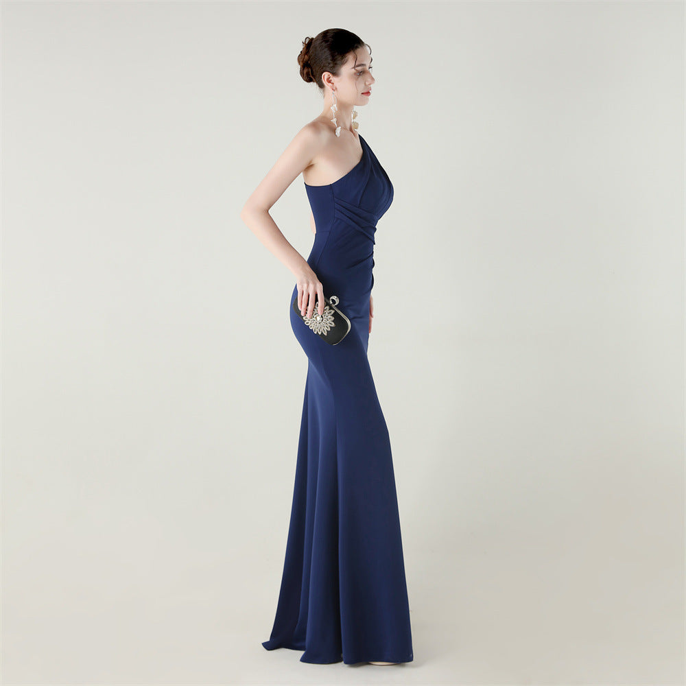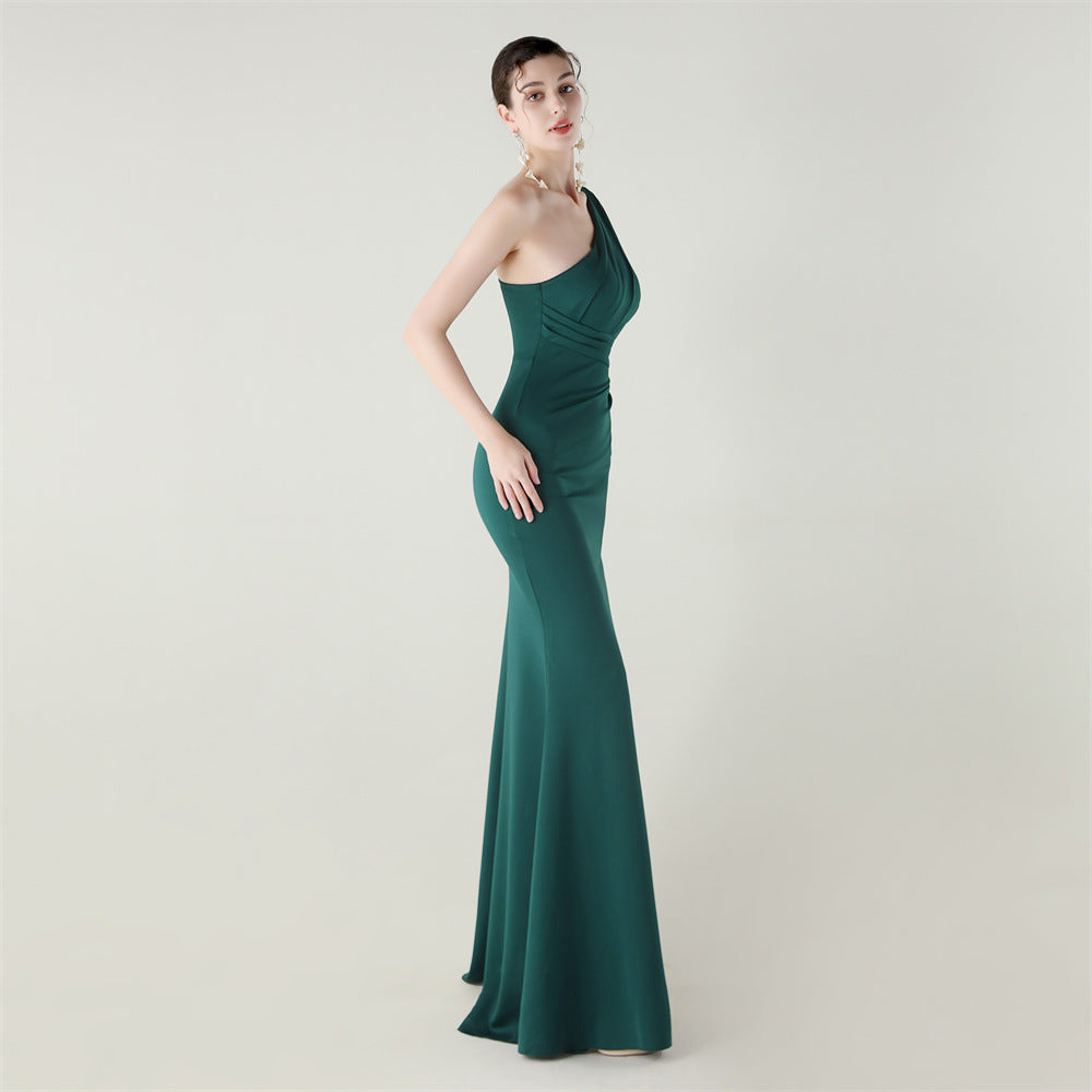 One-Shoulder Satin Mermaid Gown with Pleating & High Slit