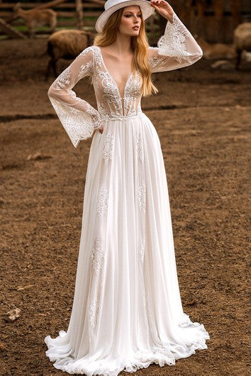 Bohemio una línea Tul Tul-Longitud Longwerve de manga abierta Vestido de novia con Ruchecing