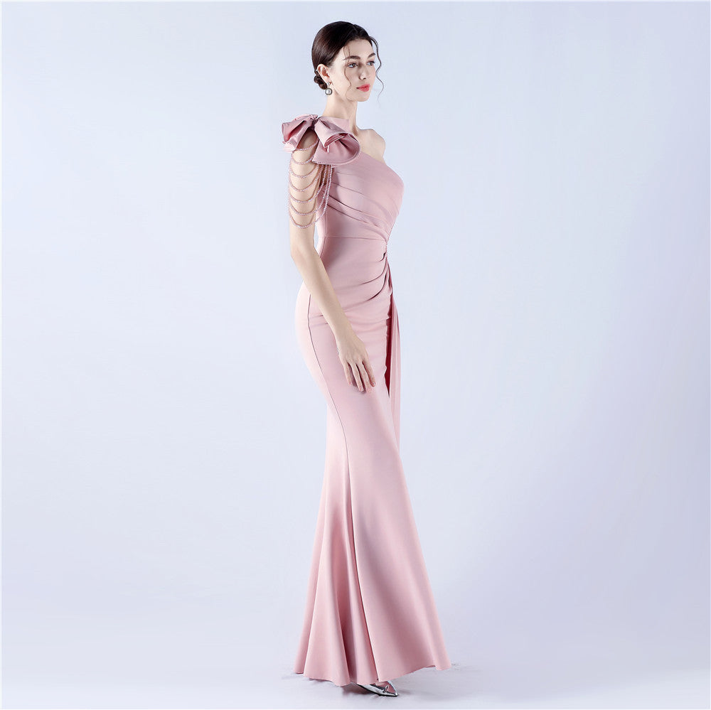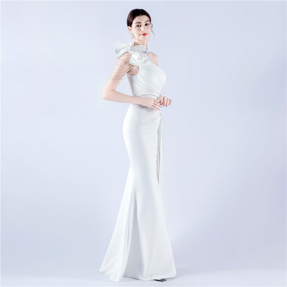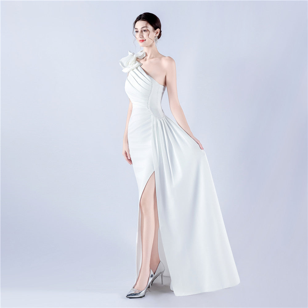 Off-Shoulder Satin Evening Gown with High Slit, Heavy Crystal Embroidery & Artistic Pleating